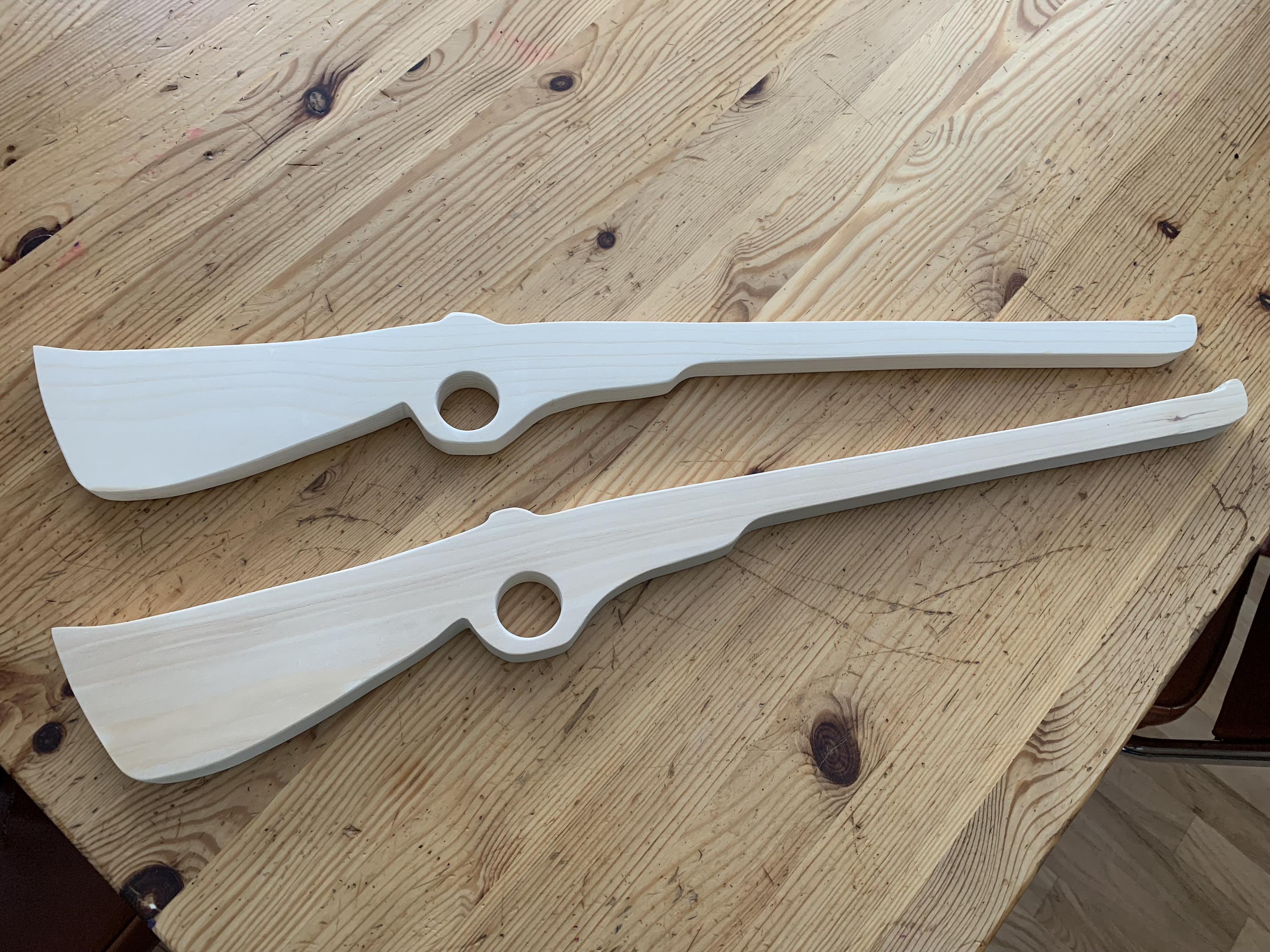 I sketched out the shape on a section of 2x4, and cut it out on my bandsaw. I used a forstner bit to drill the hole for the trigger guard. Then I split that in two on the bandsaw, to get two rifles from the same piece of wood. Then finished them with a bit of sanding and oil.